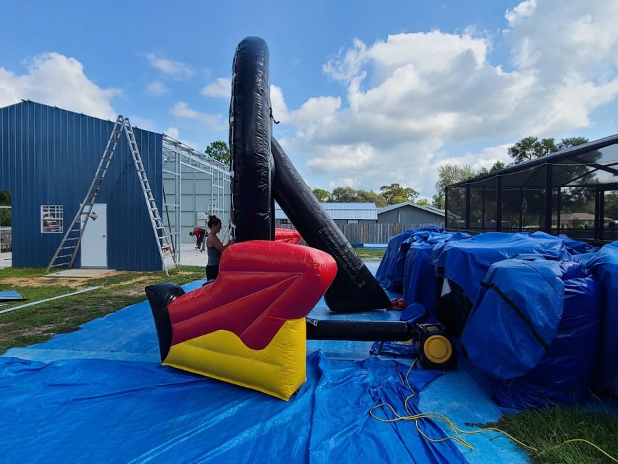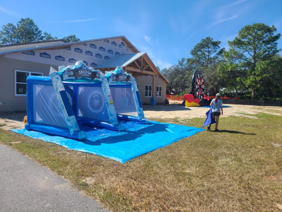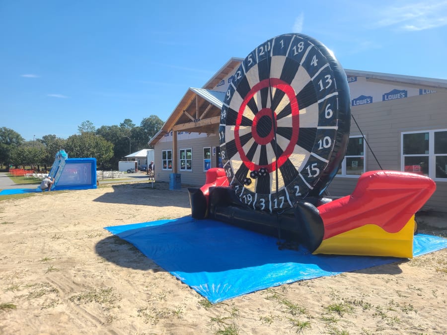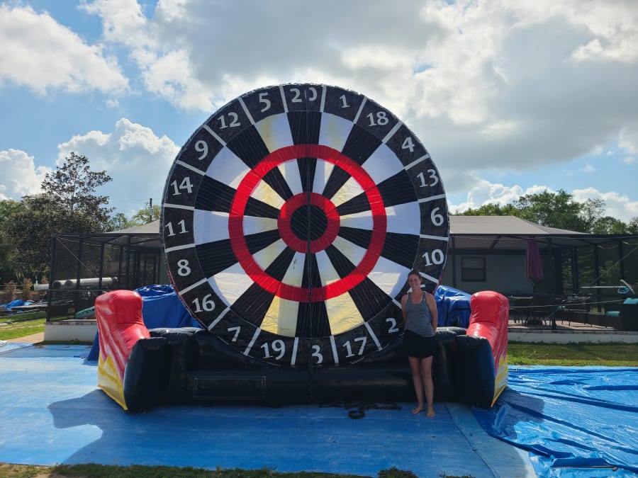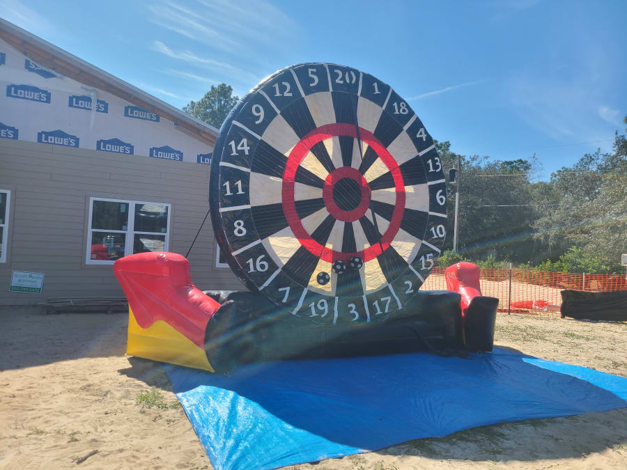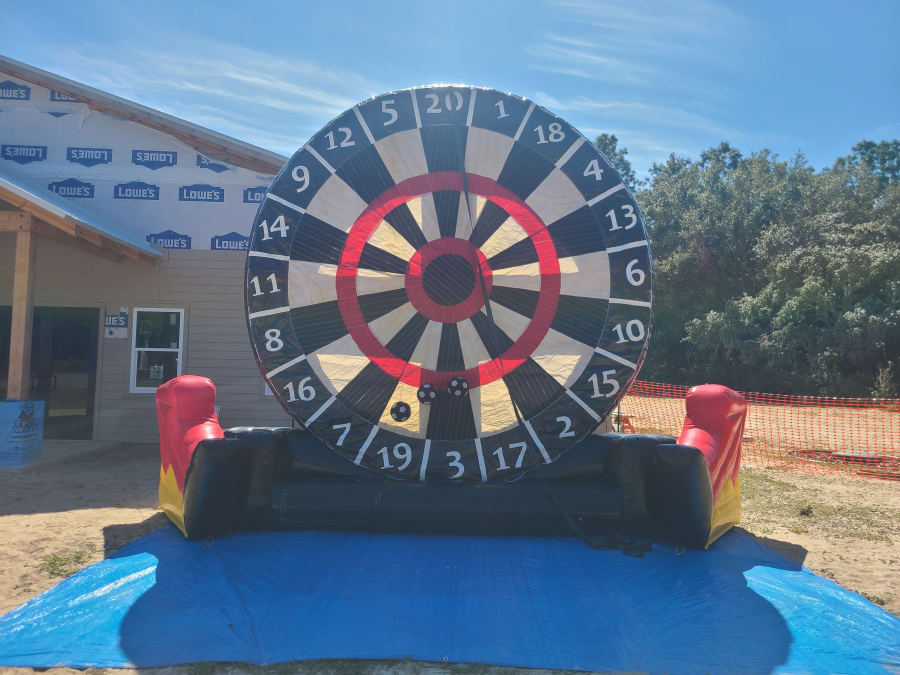 Here is our gigantic soccer darts! The goal of the game is to kick the velcro soccer balls onto the velcro wall and try to score the most points! This is a very large game that will keep your guests entertained for hours. This game will take 1 blower and we will need access to one power outlet within 100 feet of setup area. We will bring the extension cords but start thinking about what outlet we can use during your event.