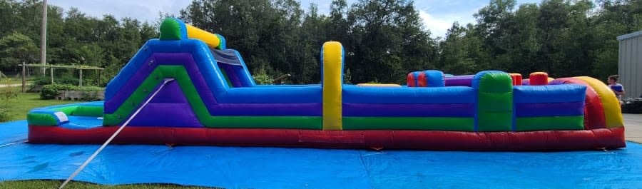 This obstacle course will take 1 blower so we will need access to 1 outlet within 100 feet of the setup area. We will bring the required extension cords but please start thinking about what outlet we may use during your event. If you are renting this unit wet, we will also need your hose to reach the slide ending of the obstacle course.