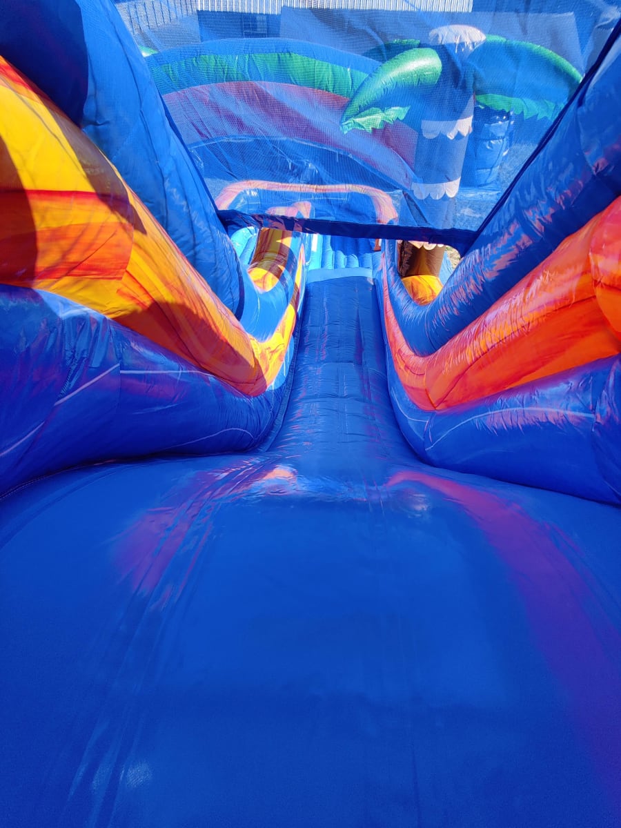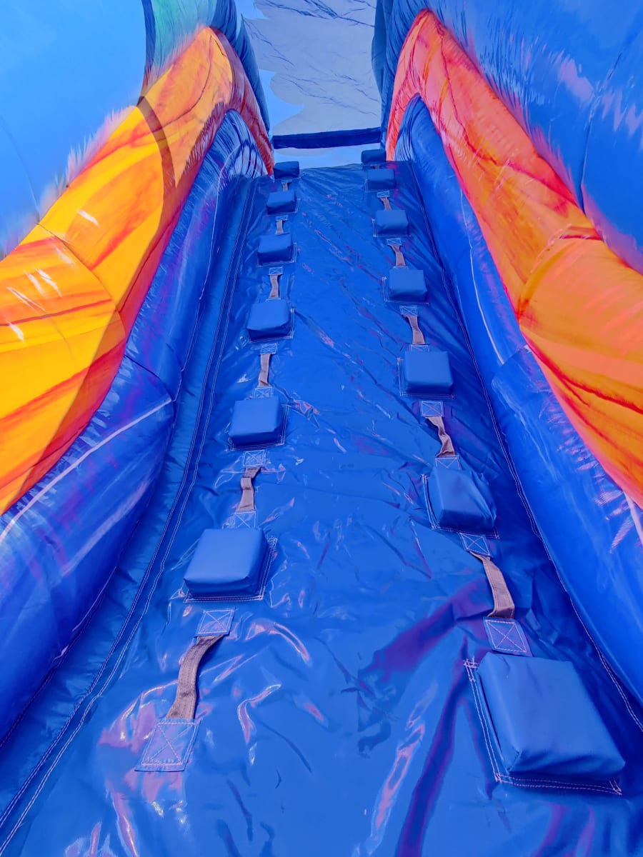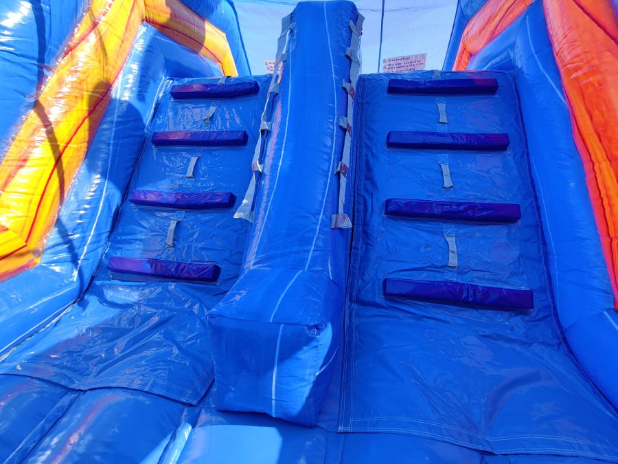 Because this unit is a 2-piece obstacle course, it will require 2 blowers. We will need access to 2 outlets on 2 separate breakers. We will bring extension cords, but power access must be within 100 feet of obstacle course setup area. This unit will require 95 feet in length, 20 feet in width and 20 feet in height.