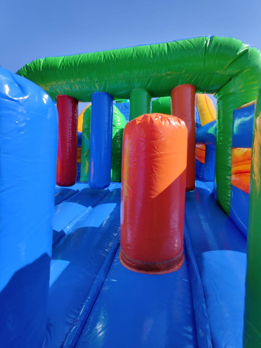 Here is our one piece 45-foot jungle trek obstacle course! Start by climbing through the obstacles, climb up a rock wall and slide down to end your journey through the jungle! This unit is 45 feet long and ends in an 18ft tall slide! This unit is designed to be used dry which is perfect for those cooler months. This obstacle course can connect to additional pieces to turn this into a longer obstacle course or an obstacle course with water.