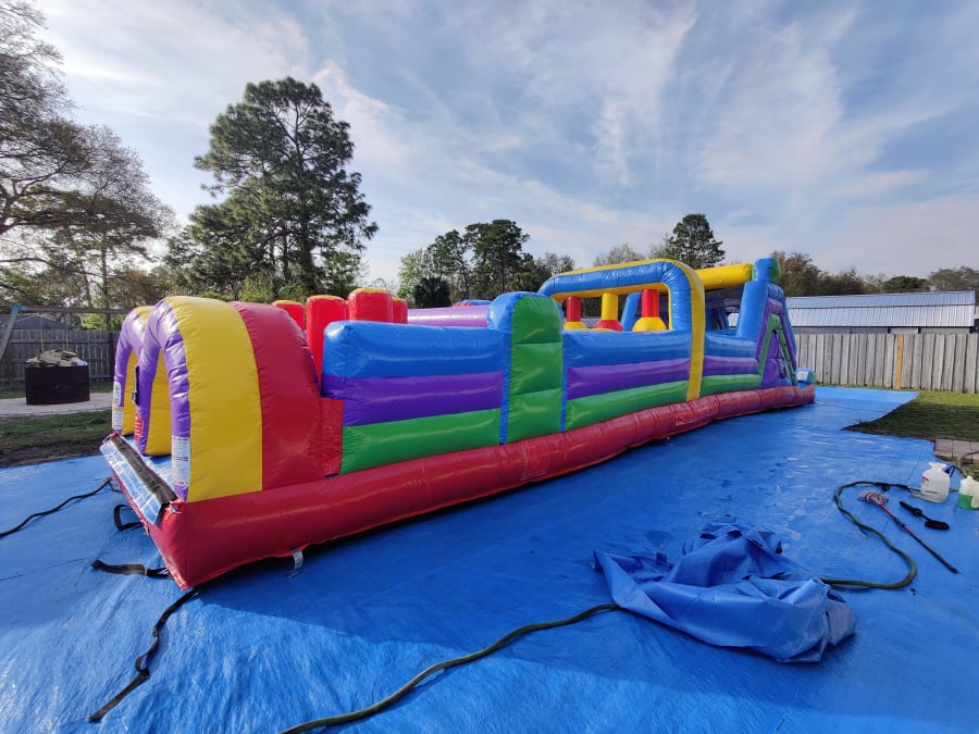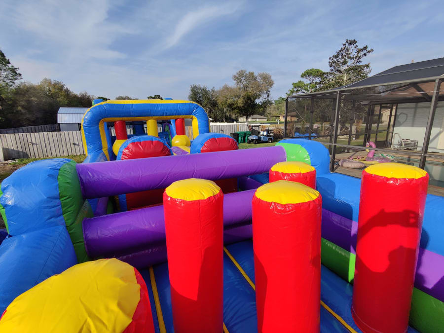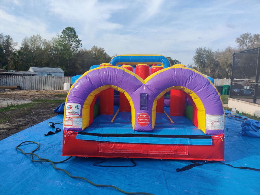 This obstacle course will take 1 blower so we will need access to 1 outlet within 100 feet of the setup area. We will bring the required extension cords but please start thinking about what outlet we may use during your event. If you are renting this unit wet, we will also need your hose to reach the slide ending of the obstacle course.