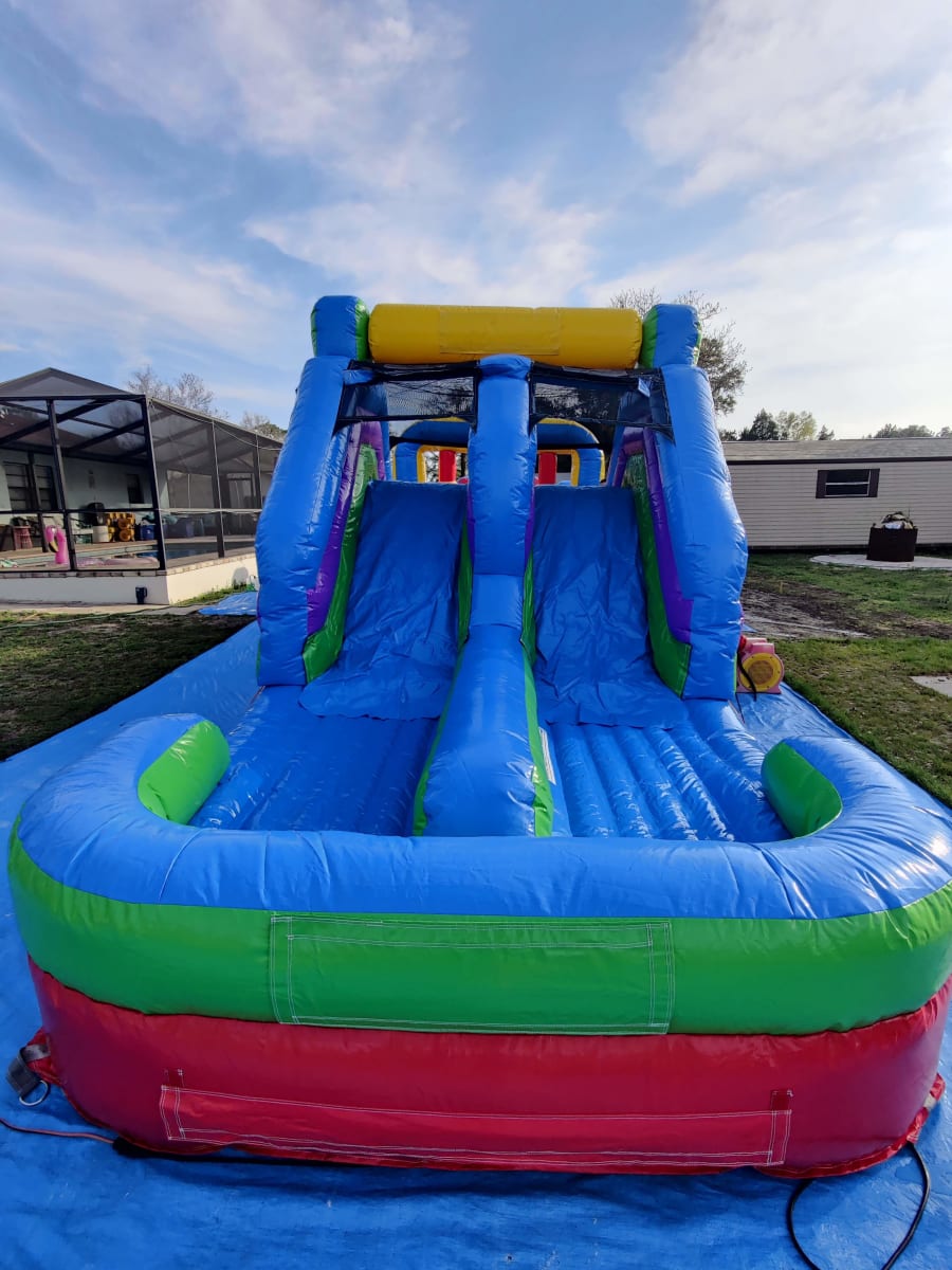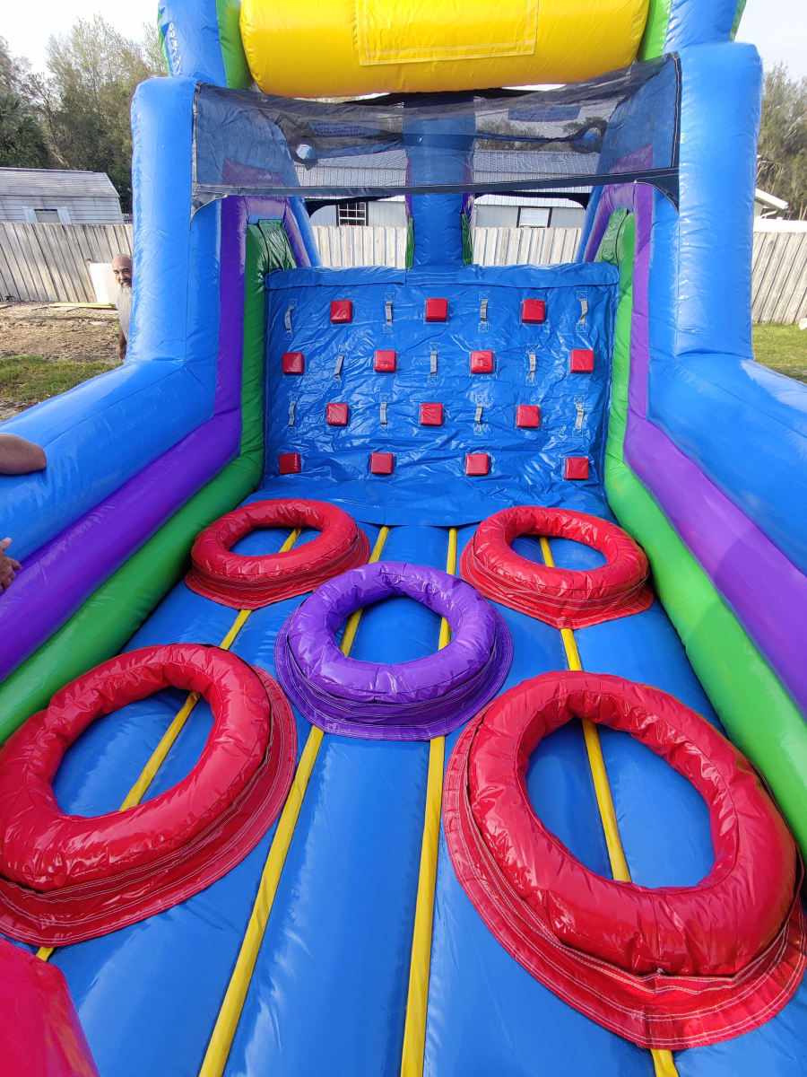 Here is our 5-color obstacle course! This unit is 48 feet long and will keep your guests busy for hours. The obstacle course will start your guests off by dodging various obstacles, climb up a rock-wall slide and then slide down the slide to the end! This unit can be run wet or dry, so this is perfect for any time of the year!