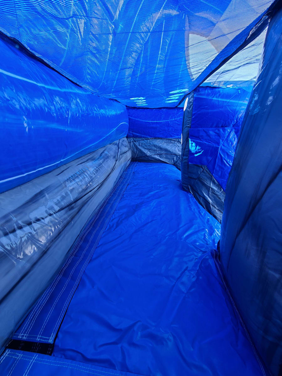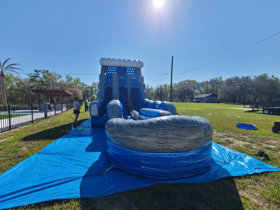 The 18' Blue Grey Wave Slide delivers show-stopping fun. This 18ft marble-style, double-lane water slide lets guests race side-by-side. It’s easy to climb with ladder handles and lands softly in an inflated pool. Perfect for birthday parties, block parties, school events, and backyard celebrations. Fast setup. High fun factor. 😄