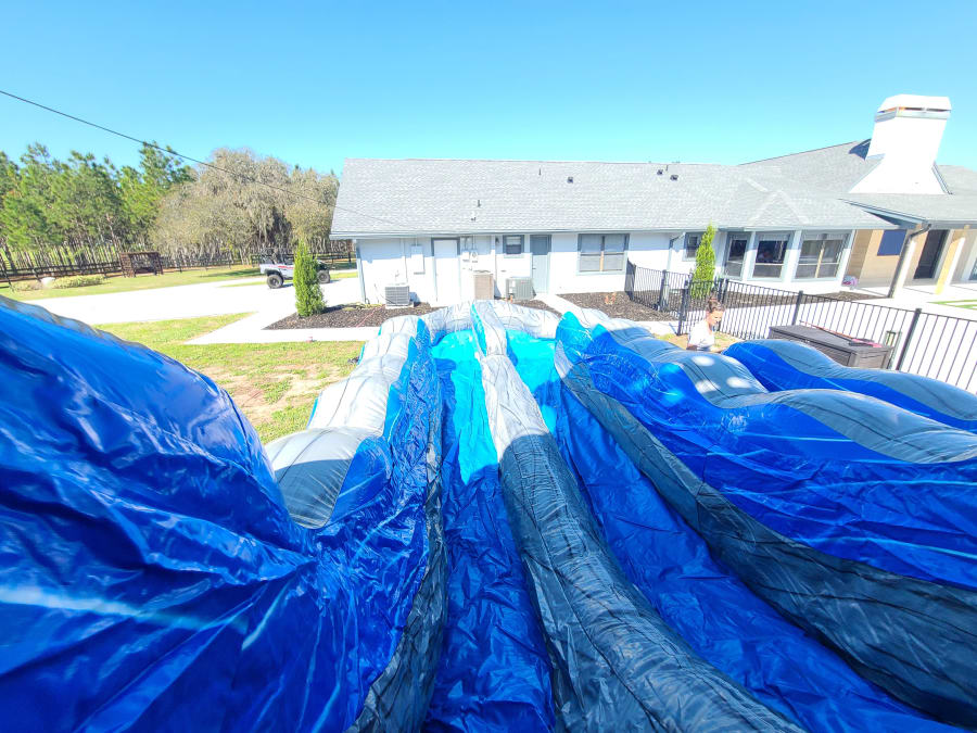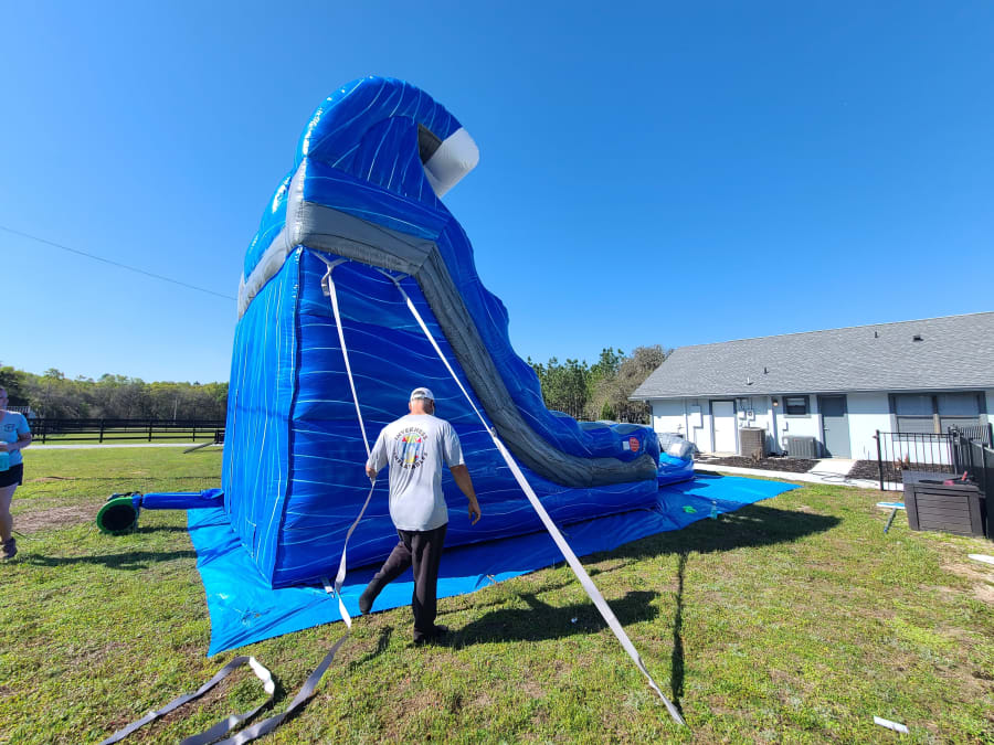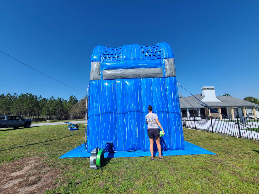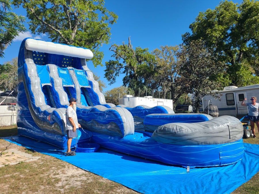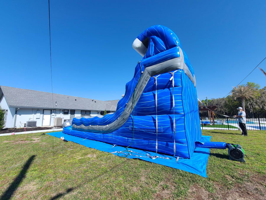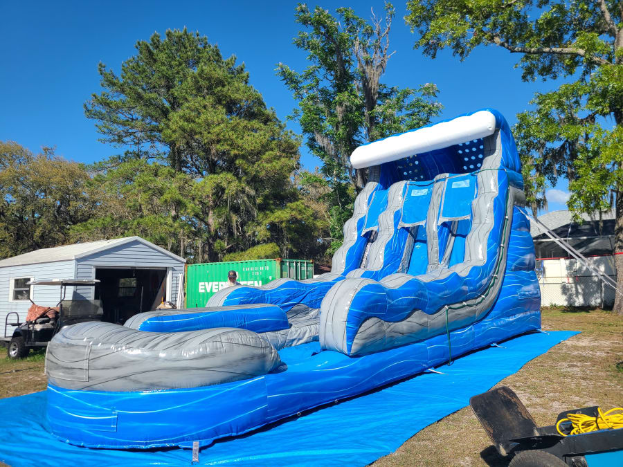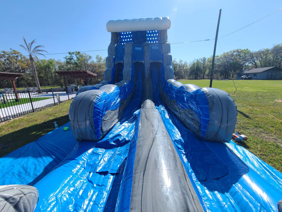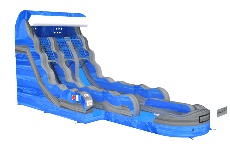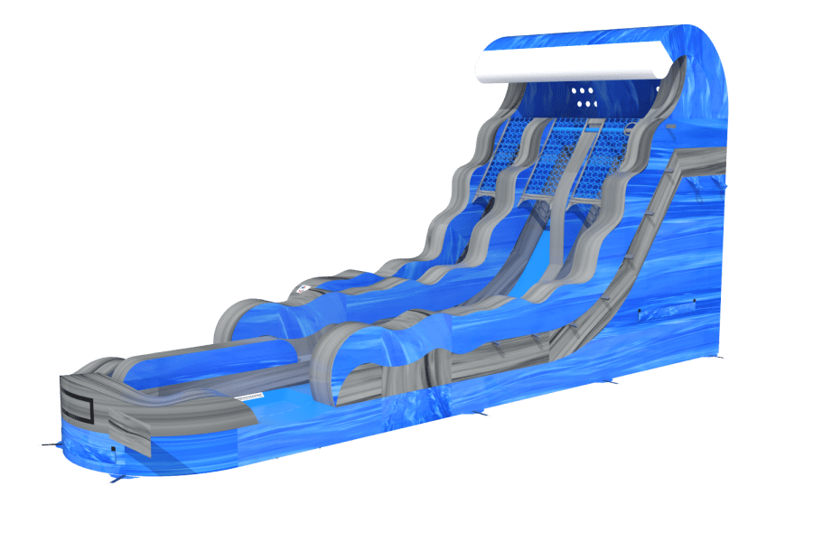 Ready to make a splash? Book the 18' Blue Grey Wave Slide today and give your guests a racing, cooling, must-try attraction. 💦
